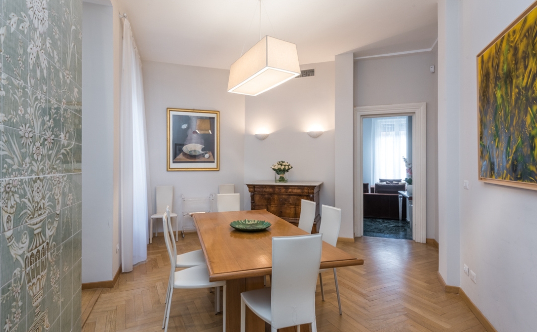 Il quartiere Coppedè, salotto romano a cielo aperto che porta il nome dell’architetto che lo ha progettato, fa da sfondo a questo splendido appartamento in stile classico. Lo stile intramontabile per eccellenza, caratterizzato da eleganza, armonia delle forme e lusso, prende vita attraverso molteplici elementi. L’architetto ha progettato gli ambienti facendo dialogare fra di loro materiali diversi che donano eleganza e pregio agli spazi: legno, vetro, marmo e cornici danno la sensazione di entrare in una casa nobile di un tempo che non c’è più.